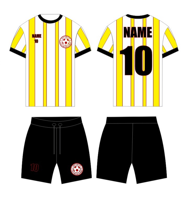 Travel Uniform #2, Yellow/White shirt with black shorts, black socks. Custom name and number. Mandatory uniform.